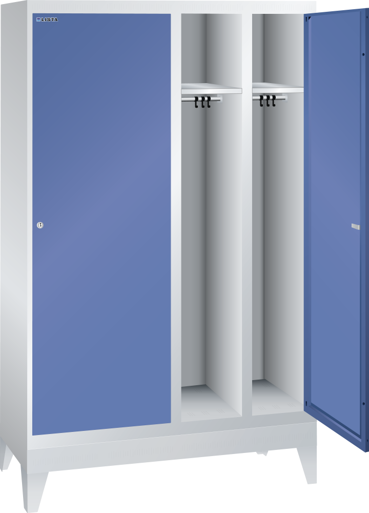 Armadi guardaroba: gli armadi guardaroba possiedono, in base allo scomparto e al modello, la dotazione seguente: 1 porta a battente in lamiera piena integrata, superficie liscia oppure con fori per ulteriore aerazione (2 scomparto richiudibile / 1 serratura per 2 scomparti), 1 appendiabiti con 3 ganci appendiabiti scorrevoli ciascuno, 1 porta asciugamani.