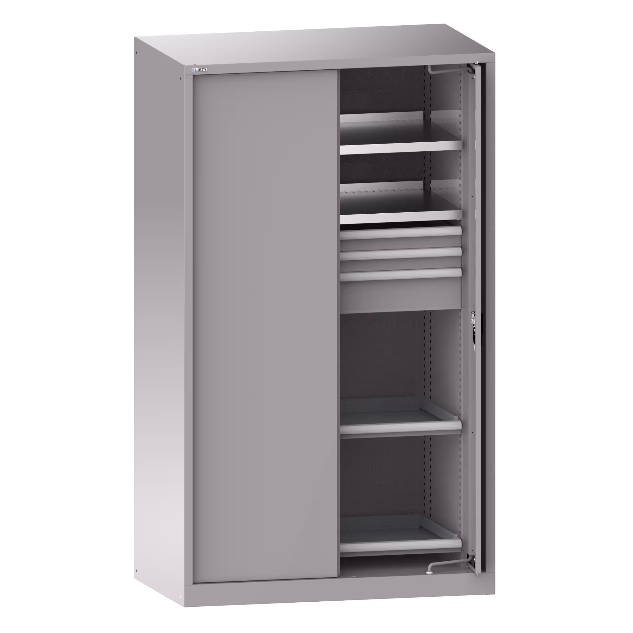 Armadio per merci pesanti con 2 ante a scomparsa in lamiera piena 54x27E (LxPxA) 1146x690x1950mm 2 ripiani spostabili, 3 cassetti, 2 ripiani estraibili KEY Lock Alluminio grigiastro RAL 9007