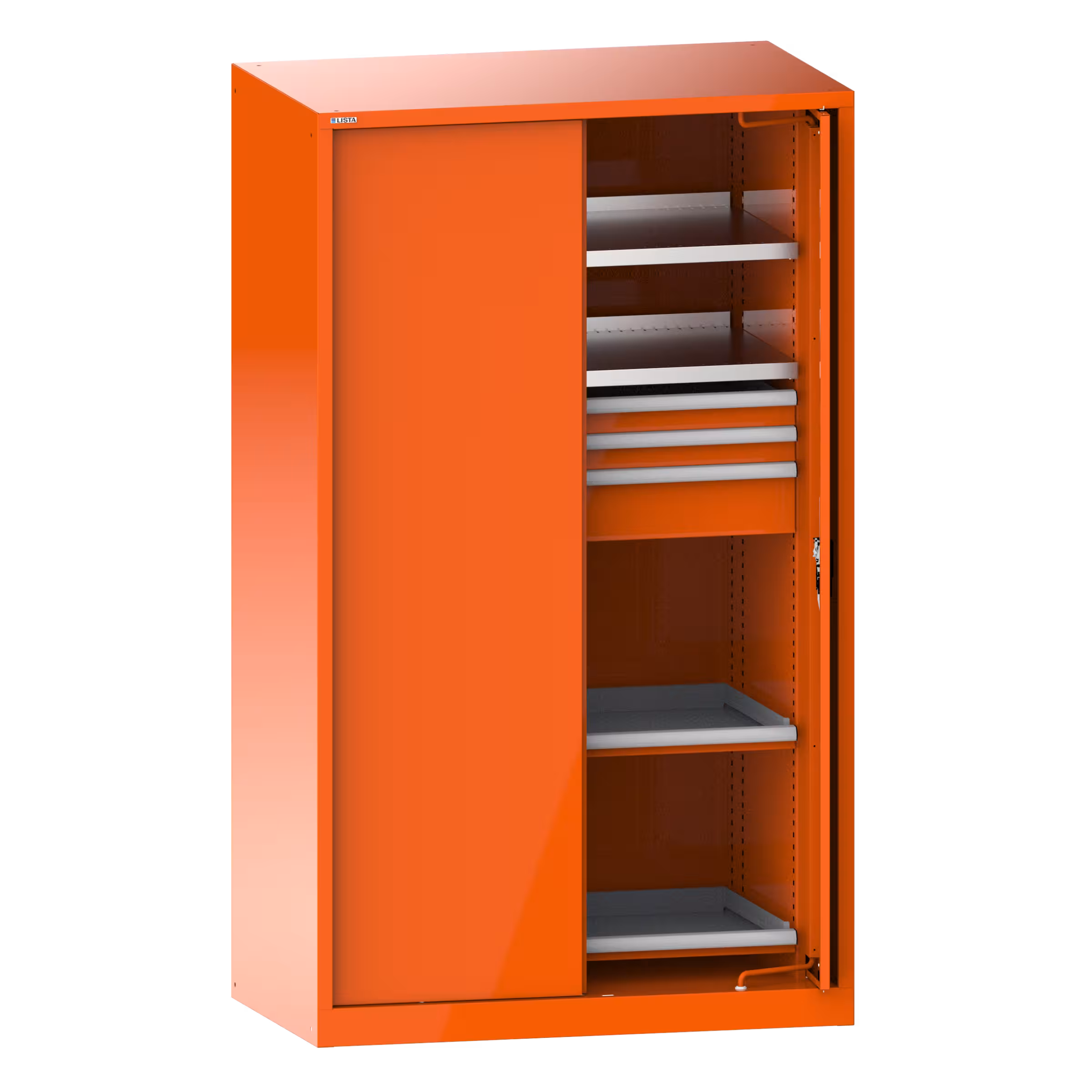 Armadio per merci pesanti con 2 ante a scomparsa in lamiera piena 54x27E (LxPxA) 1146x690x1950mm 2 ripiani spostabili, 3 cassetti, 2 ripiani estraibili KEY Lock Arancione RAL 2004