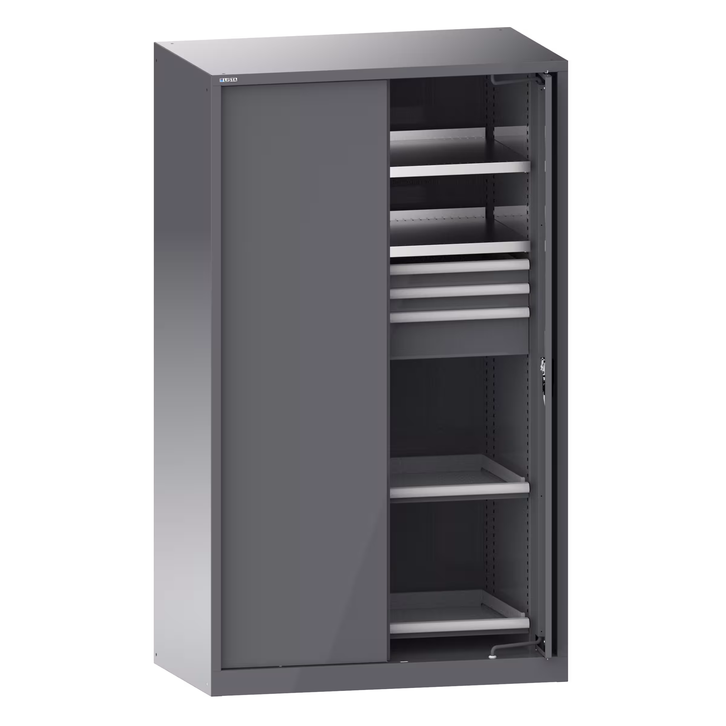 Armadio per merci pesanti con 2 ante a scomparsa in lamiera piena 54x27E (LxPxA) 1146x690x1950mm 2 ripiani spostabili, 3 cassetti, 2 ripiani estraibili KEY Lock Grigio metallico NCS S 6502-B