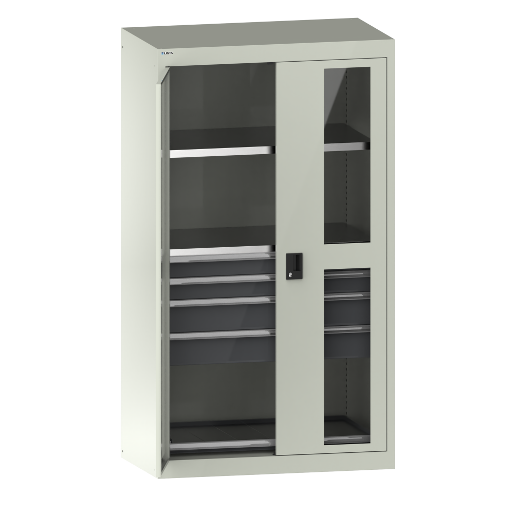 Armadi per merci pesanti con porte battenti: gli armadi sono dotati di: ripiani spostabili zincati, 35 mm spessore, ripiani estraibili e cassetti verniciati solitamente in grigio, NCS 4502-B. Porte battenti smussate su una parte, a scelta in lamiera piena oppure con riquadri trasparenti. Possibili chiusure KEY Lock, CODE Lock o RFID Lock.
