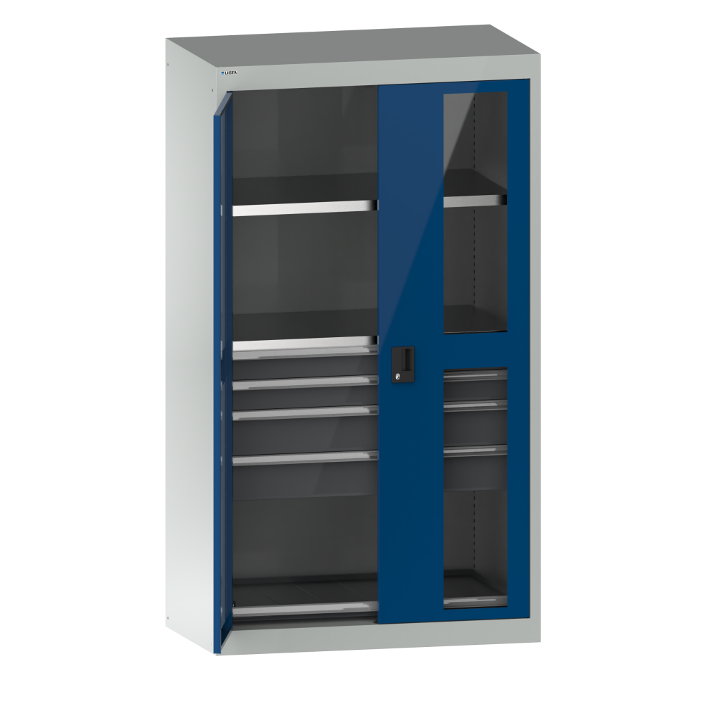 Armadio per merci pesanti con ante a battente con riquadro trasparente 54x27E (LxPxA) 1100x641x1950mm 2 ripiani spostabili, 4 cassetti, 1 Ripiani estraibili RFID Lock Grigio luce RAL 7035 / Blu segnale RAL 5005