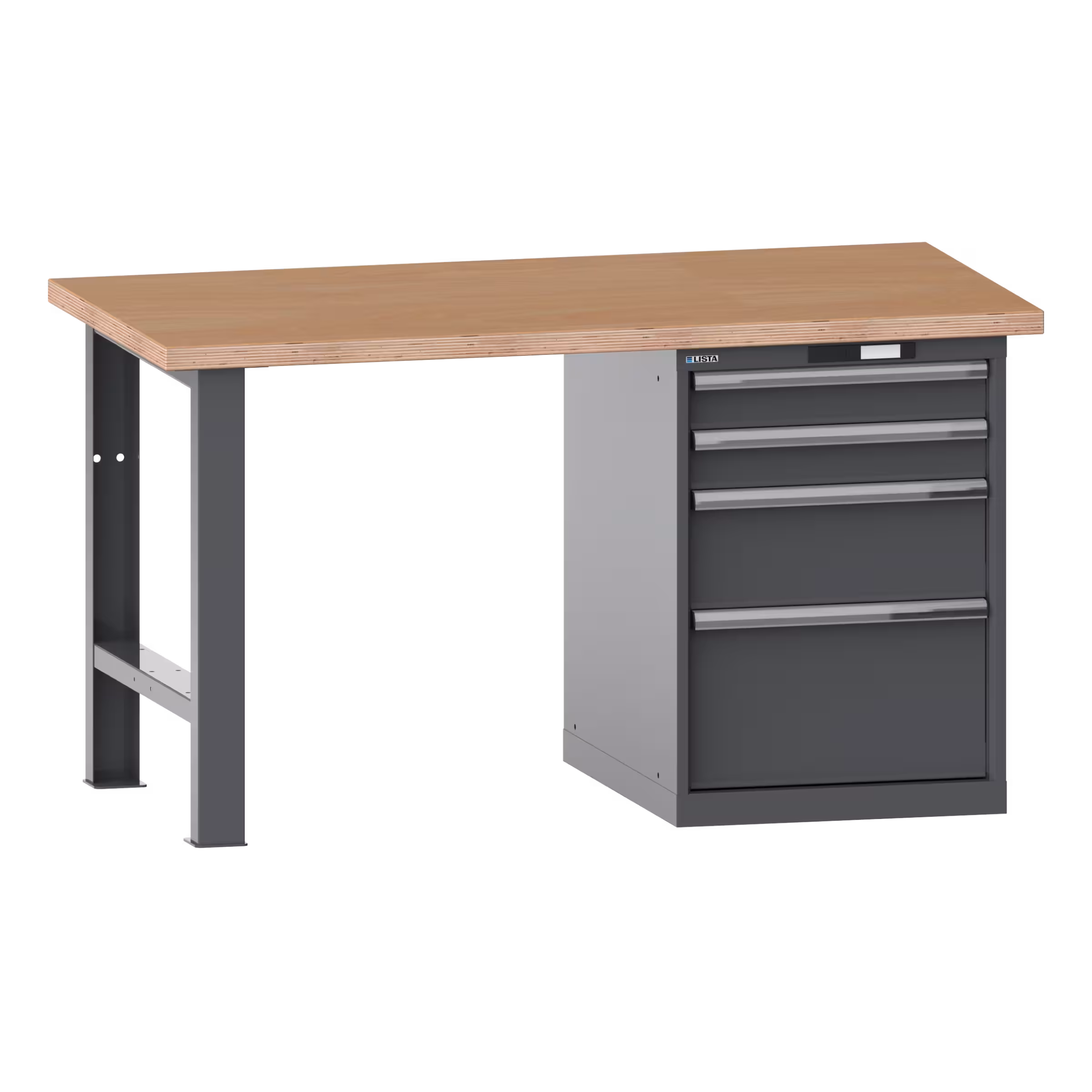 Banchi da lavoro: con piani in multiplex o in faggio, inclusi premontaggio e materiale di fissaggio. Armadio a cassetti montabile sia a destra sia a sinistra.