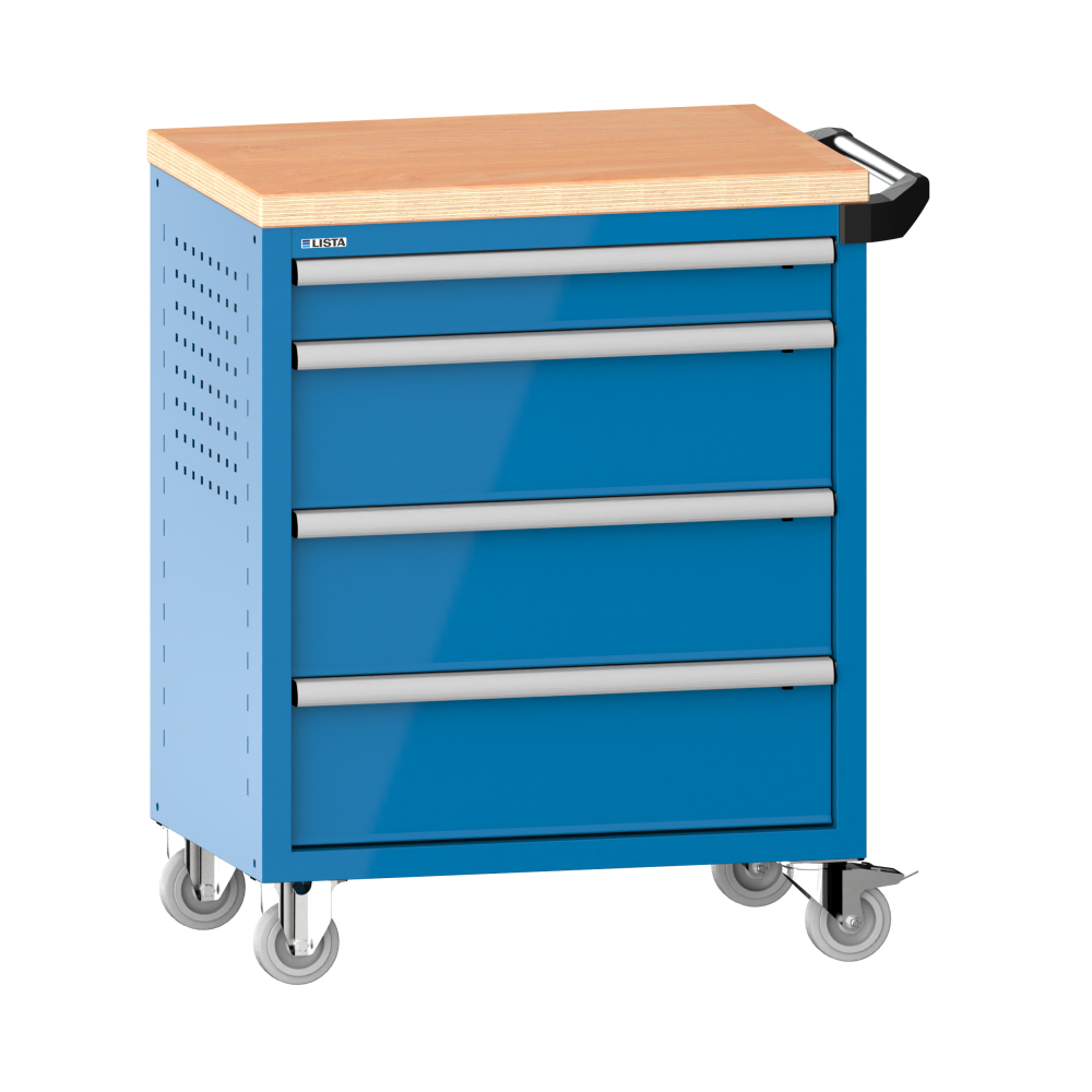 Carrello per utensili 36x27E (LxPxA) 833x525x945mm 4 cassetti (1x100/3x200) 40kg con copertura in legno multistrato cricchetto singolo a destra KEY Lock Blu luce RAL 5012